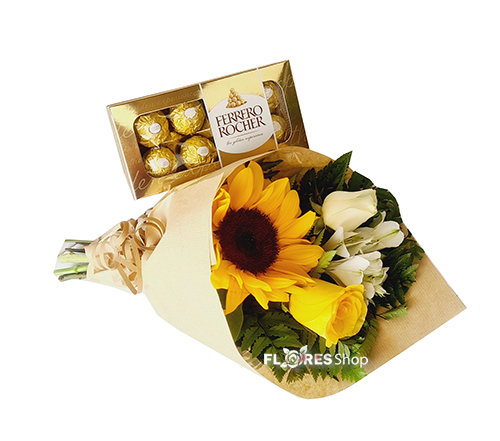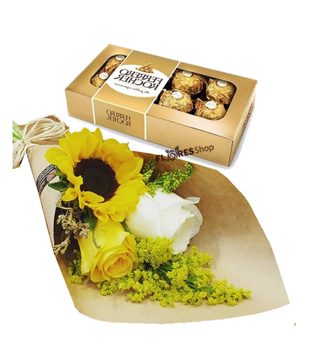 Mini Ramalhete de girassol + rosa branca e rosa amarela embalado para presente mais Ferrero Rocher.